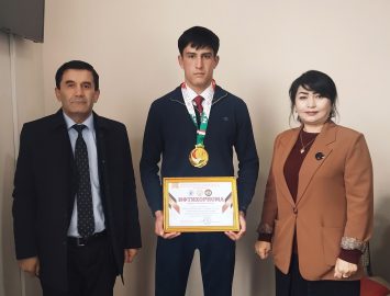 Ректори Донишкада профессор Бахтиёр Маҳмадалӣ ба донишҷӯи варзишкор ва муваффақи Донишкада Бегзода Раҳмиддин, ки дар...